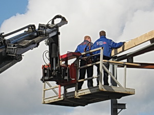 Veenstrakraan ingeschakeld, een arm met een mandje… Twee passagiers in werkkleding, gunstig weer. (“beter dan vanmorgen”, vertelde een van de helpers op de begane grond).
