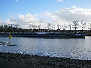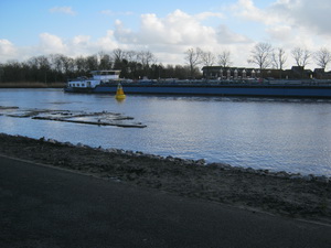 Via de Mokkenburgweg, de boerderijhond van De Jong en het veetunneltje belanden we op de weg terug langs het kanaal. De scheepvaart blijft aan de goede kant van de boeien. De komende week wordt toch weer begonnen met het verder uitdiepen van het Van Starkenborghkanaal. De bochtverruiming voltooien. (Aan deze kant van de boeien is het nog ondiep….)