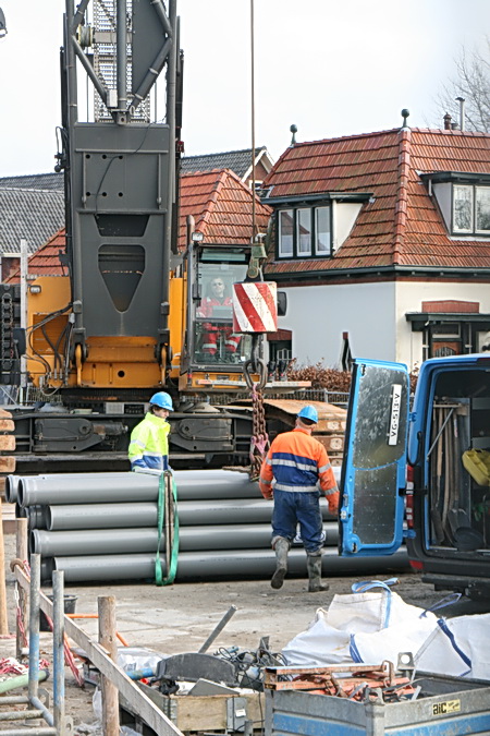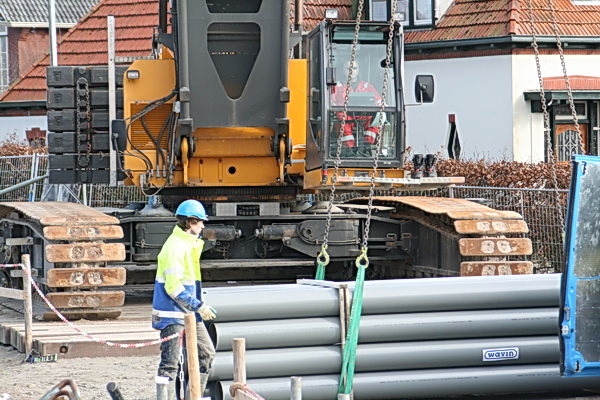 Samen met de ervaren “Staphorster” (zoals Jan Thijs de H. hem noemt…) draagt de jonge GMB’er zorg voor de verzending van plastic Wavin-buizen…. Terwijl de buizen door de hijskraan naar de Kruizingakant worden getild, lopen beide vrijdagmiddaggetrouwen naar diezelfde kant om de buizen in ontvangst te nemen….