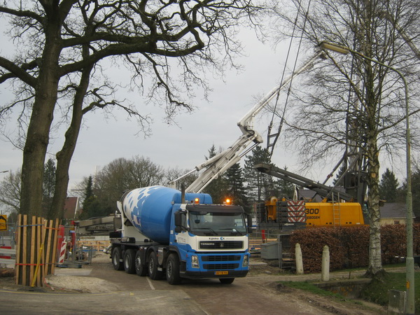 De betonauto bij de inrit van het werkterrein (en voor de uitrit van tunnelbuurman Willem Wieringa, die 5 maart jarig was… Wat? Willem jarig? Willem is al het hele jaar jarig!! Houdt pas op als de tunnelklus is geklaard….)