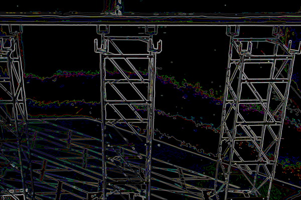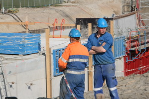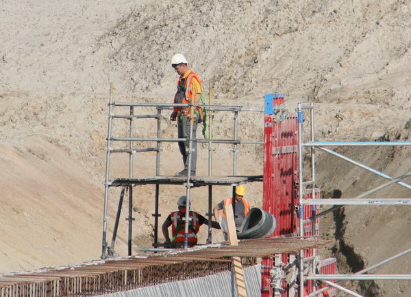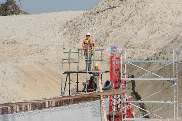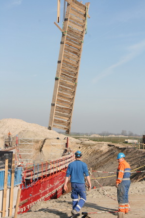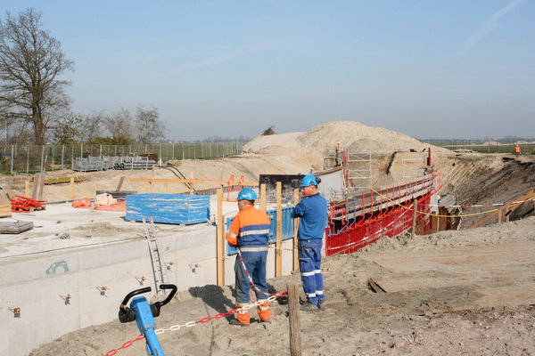 Achteraan bij de verbinding van moot 2 met moot 1 (neem ik aan…) zijn de steigerbouwers actief. Hun ‘kunstwerk’ nadert de voltooiing… Even iets dichterbij…