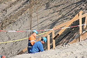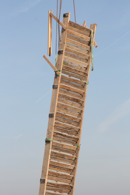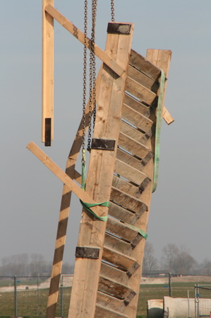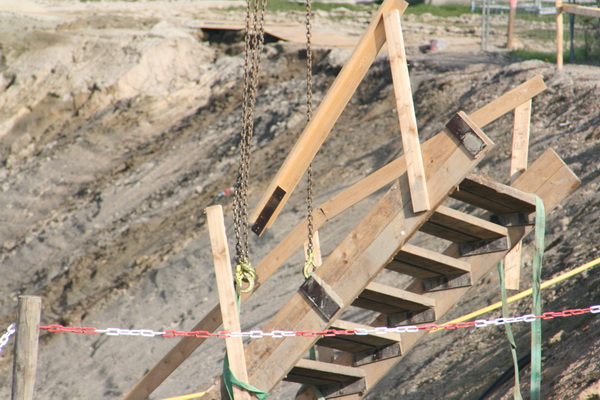 De houten trap van de bovenwereld (zuid) naar de spelonk bij de tunnel wordt verplaatst, per hijskraan…