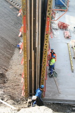 Vanaf het baggerwerk nabij de spoorbrug (aan de westkant) terug naar de tunnelbouw, met name de noordwestkant, waar nog iets viel te verhapstukken met een bekistingsplaat…