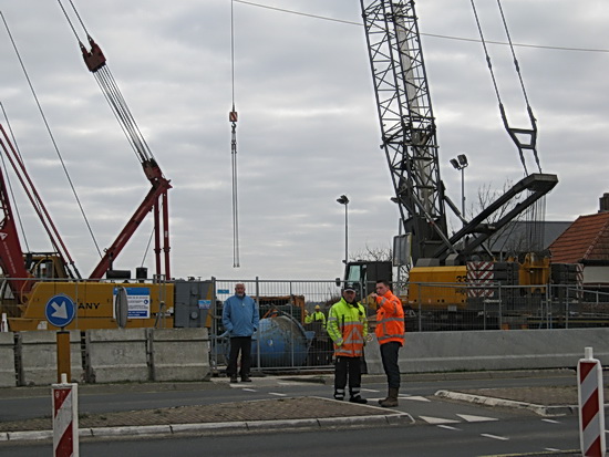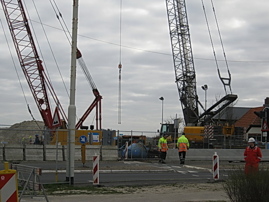 Verkeersregelaars centraal in beeld, rechts nadert de kraanmachinist van de grote hijskraan rechts. Even een bakje koffie drinken.. Hij vertelt dat er sinds kort bij beide tunnelkuipen een webcam staat opgesteld. “Waar kun je de beelden bekijken?” Ik moet het antwoord schuldig blijven, maar zal mijn licht opsteken…….