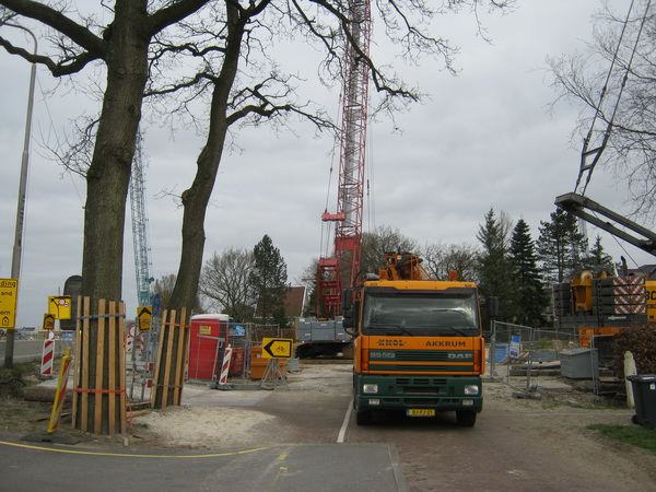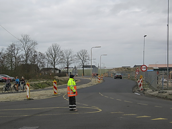 Situatie op de plek waar de Industrieweg uitkomt op de N355 en links de tijdelijke verbinding met de Langestraat Zuid is afgesloten. Links is nog net het front van de Top-Trans-vrachtwagen te zien die achteruitrijdend zijn vracht komt halen. Betonplaten? Er zijn verschillende verkeersregelaars ingezet die het verkeer in goede banen leiden. (Het haperen van de oude verkeersbrug, nee, dat kun je de regelaars niet aanwrijven…)