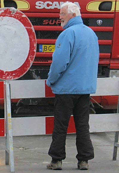 Truck met aanhanger van Top Trans met chauffeur William die net het portier opendoet, aan de rechterkant… Gaat zeker zijn helm even pakken… Links de GMB-grijper, door Jan Thijs de H. liefkozend “de blauwe engel” genoemd…. (Al stel ik me bij een engel toch niet direct een grijper voor… En de kraanmachinist “de blauwe kapitein” zie ik ook niet zo als engelbewaarder…)