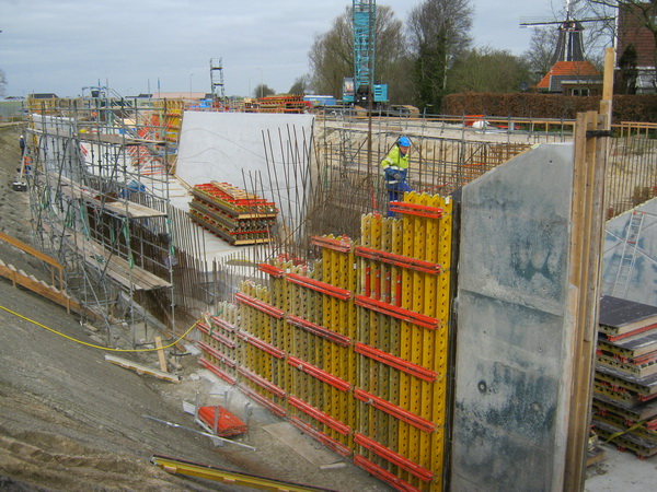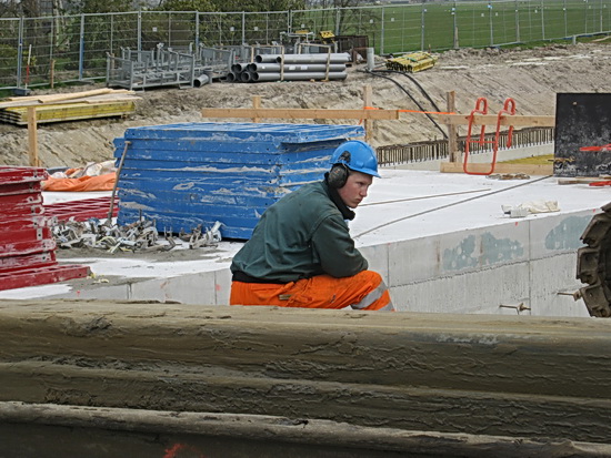 Het ochtendbeeld bij de tunnelkuip aan de noordwestkant. De bekisting van moot 6 is intussen verwijderd, als ik het vanavond goed heb gezien…. Morgen maar eens weer kijken! (Is er ook beton storten bij de NVH-brug)