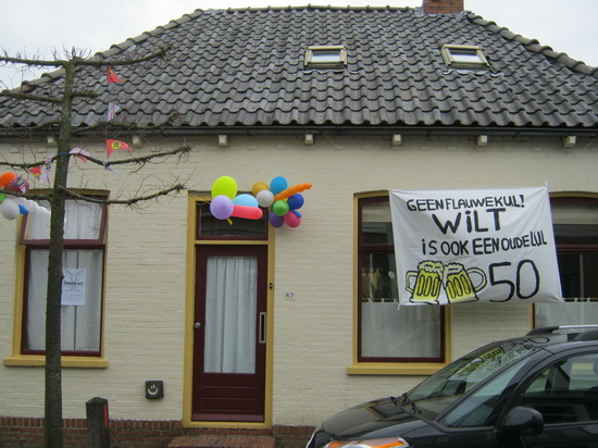 In de Langestraat (Midden) is het huis van de familie De Boer opnieuw voorzien van versieringen en een spandoek! Deze keer betreft het Wilt zelf, de 50 bereikt. Van harte gefeliciteerd!