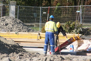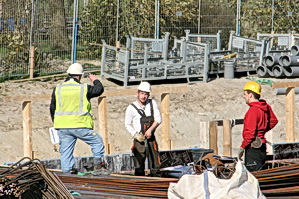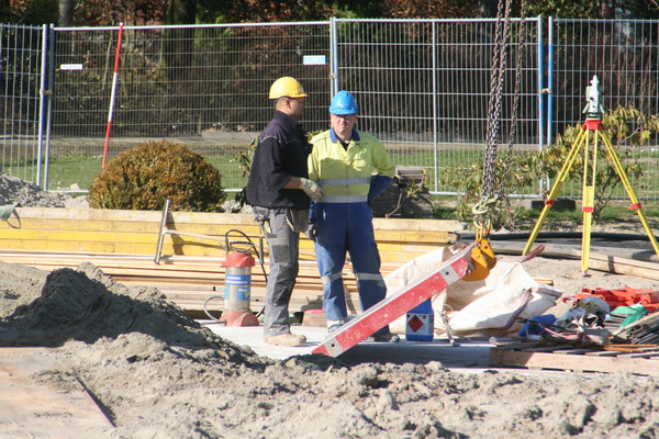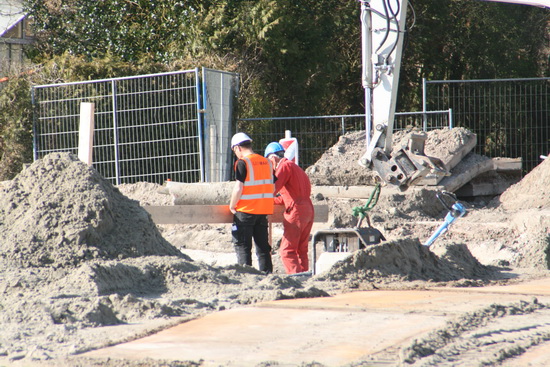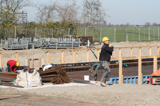 Op de voorgrond de GMB’er die contact onderhoudt met de kraanmachinist in verband met het transporteren van de bekistingsdelen. Op de achtergrond enkele vlechters, bezig met de wapening van het dek van moot 3, waarop komende vrijdag beton wordt gestort, naar verwachting. (De vlechters zijn in dienst van een Duits bedrijf, BCS als ik het goed heb verstaan).