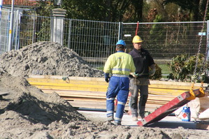 Twee vertrouwde tunnelwerkers die zich bezig houden met een bekistingspaneel. Schoonmaken, insmeren, wegtakelen naar de plaats van bestemming. Toch moot 1, denk ik… (Dicht bij de bult, moot 1 blijft open, krijgt rechte wanden, hoger dan de andere, met een reliëf!)