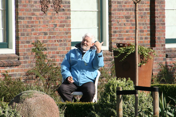 Weg van de tunnel… De benenwagen verlangt BEWEGING! En wie zit daar te zonnen in zijn voortuin, op de eerste rij??! Midhorncorrespondent en wegverleggingswatcher Jan Thijs de Haan, zo te zien liftend…. Of wil hij mij weg hebben? “Doorlopen a.u.b.!” Aha, nu begrijp ik het…. Kijk maar eens naar Jan Thijs zijn rechterhand, hij heeft een forse greep in de koekjestrommel gedaan en wil daar nu optimaal van profiteren onder deze zomerse omstandigheden….