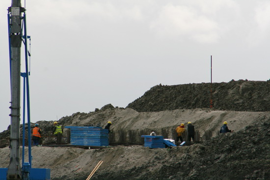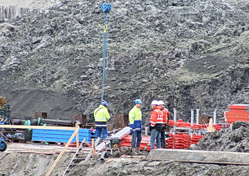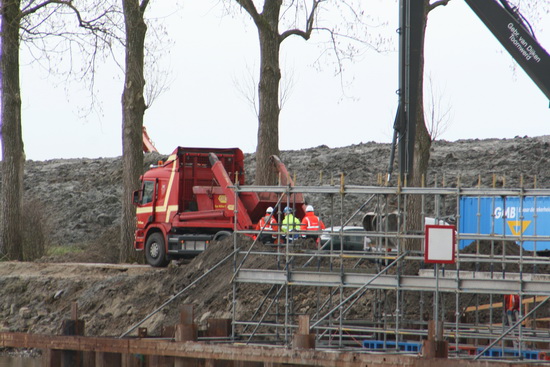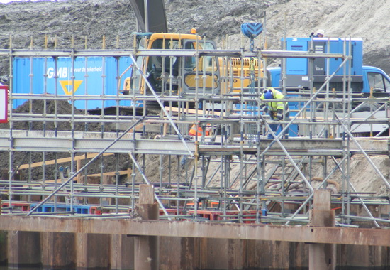 Nee, ook deze kiek is niet mooi… Wel geeft ie duidelijk aan dat er binnen in de damwandkuip van zeven meter diep bekisting wordt aangebracht!