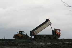 De blauwe kapitein is nog steeds bezig de situatie bij de noordelijke pijler te verbeteren. In zijn schaduw (en in die van de pijler) strijkt GMB-René het zand glad en stampt het aan met de trilmachine.