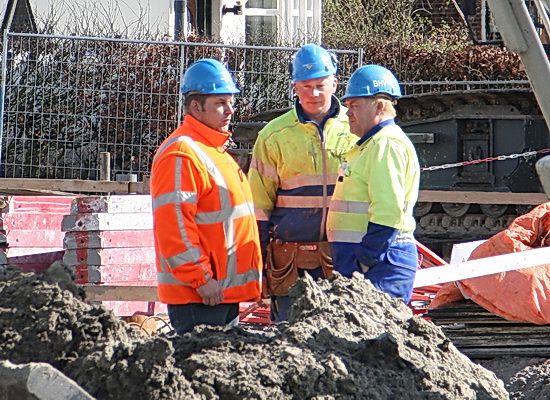 Zie je, het is hem echt! Mooi, die verschillende gezichtsuitdrukkingen… De blik waarmee Henk naar zijn overbuurman kijkt, zo van “Dat zeg je nou wel, maar ik denk er het mijne van…” Uitvoerder Arjan heeft zijn gedachten bij iets anders…