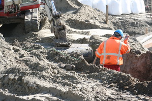 Tuurlijk wordt er ook gewerkt, verkijk je daar niet op! Vooral die leidingen doen er toe, dat moet perfect, voordat ze onder de aarde verdwijnen. De driepoot staat er op de neus bij, dan is de Geomaat-meter niet ver! Het GMB-drietal is trouwens al een kwartet geworden…