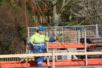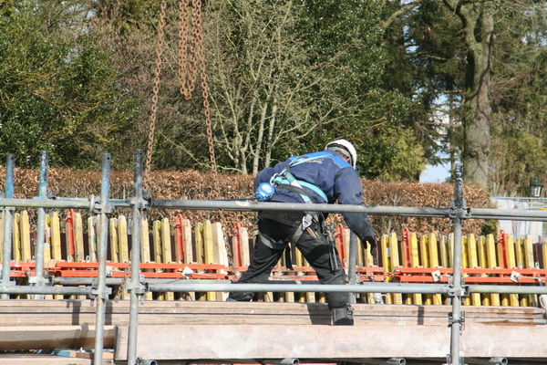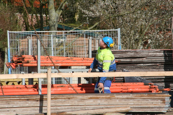 Het gaat om een bundel houten planken die je niet zo maar even over je schouder legt en wegbrengt… Takelen dus, de super kraan staat er borg voor! Essentieel voor deze GMB-werker is in direct contact te staan met de kraancommandant, aanwijzingen in woord en gebaar…