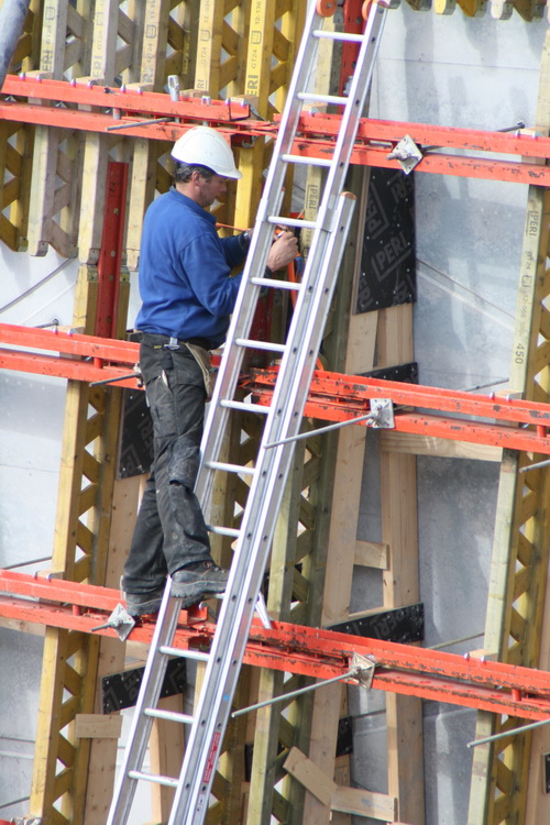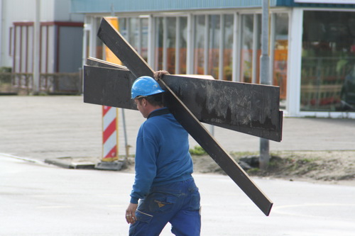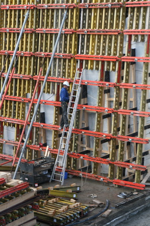 Nee, hier begrijp ik nog steeds niets van! Daar is al een gestorte muur met reliëf, wordt daar nog iets tegenaan gebouwd. En er zit iets driehoekigs tussen… Deze constructeur weet het waarschijnlijk prima, staat daar heel ontspannen ergens in de hoogte zijn ding te doen…