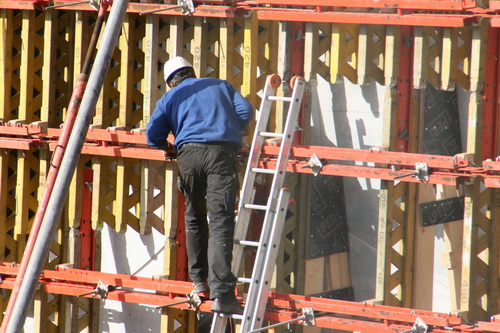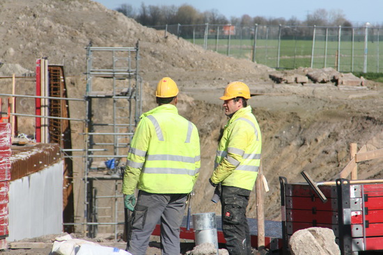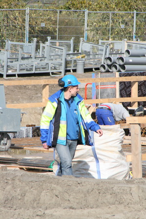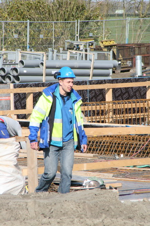 Twee alternatief geklede werknemers die in ieder geval iets met de bekisting te maken hebben. Of met het beton? Nee, niet met het wapenen… De vlechters zijn elders, waarschijnlijk bij het kanaal, aan de zuidkant, de pijler en de landhoofden…