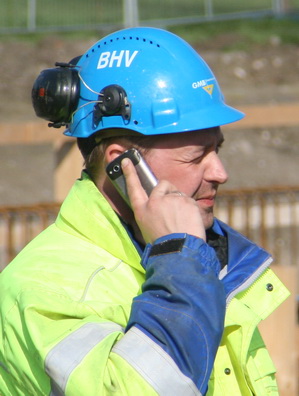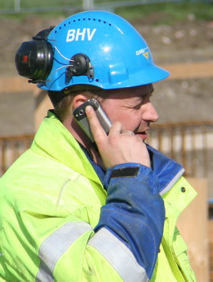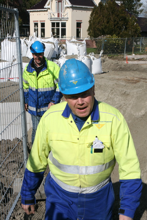Verkijk je hier niet op! Hier wordt technisch manager Bernard van Noordenburg “uitgedaagd” zijn hekverplaatsingskunsten te vertonen. Pas nu valt me het verschil op in de bedrijfskleding. Toch allemaal GMB’ers… Betekent dat kleurverschil iets in de hiërarchie?