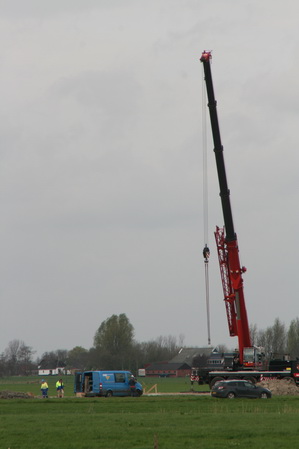 Daar middenin de weilanden van veehouderij Holtman wordt een veetunnel gebouwd, waardoor het vee straks niet via de rijbaan hoeft te worden verweid, of voor het melken naar de boerderij wordt gedirigeerd. Mammoetkraan van Wagenborg, blauw GMB-busje, donkere personenwagen die volgens mij in gebruik is bij hoofduitvoerder Kees Kranenburg…