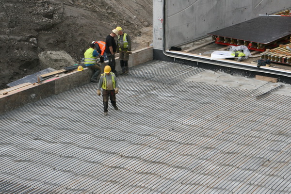 Aangekomen bij het tunnelterrein, het loopt inmiddels tegen half een…, zie ik de vlechters in druk overleg bij moot 5… De werktekening ligt net achter het muurtje….