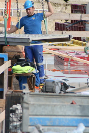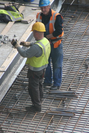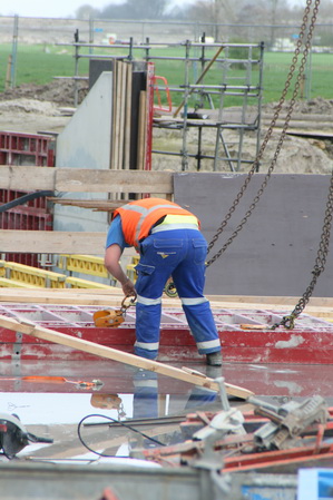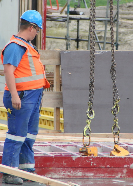 De vlechter die de communicatie met de kraanmachinist aan de noordwestkant verzorgt. Op de achtergrond een van de GMB-timmerlui van de ‘oostkant’, “even iets halen! (Of wegbrengen…)”