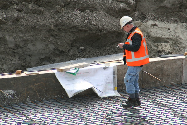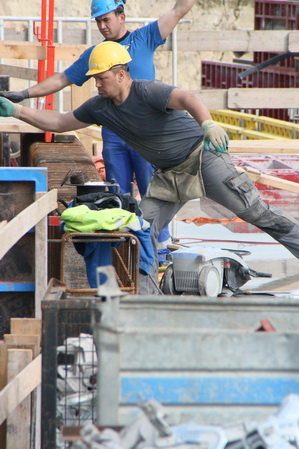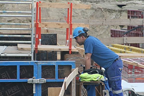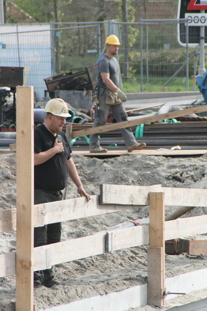 Terug bij de oostkant, op het dak van moot 3, waar René terug is van weg geweest… Hij koppelt de bekistingsplaten en kijkt kritisch naar wat er volgt…