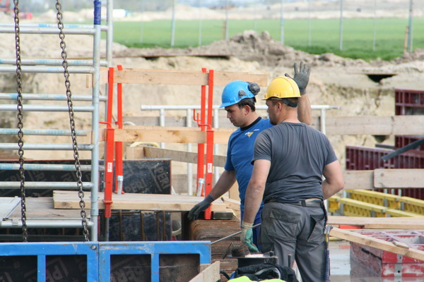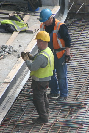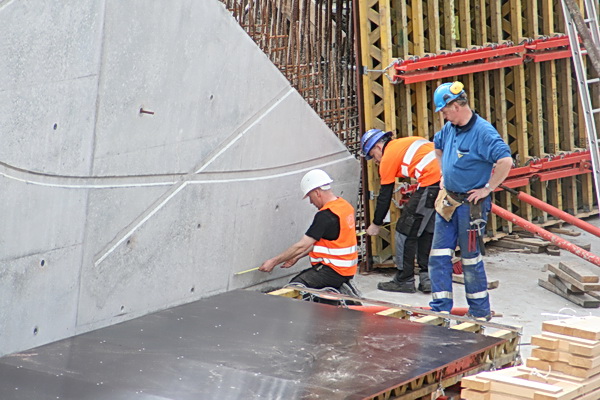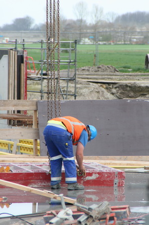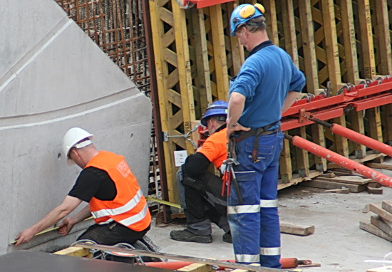 De bekisters in moot 6, druk in de weer met het passend maken van de panelen. Moot 6 heeft immers nog maar halve muren, de verbinding met moot 7 wordt stap voor stap gerealiseerd.