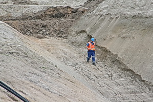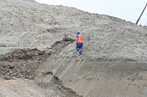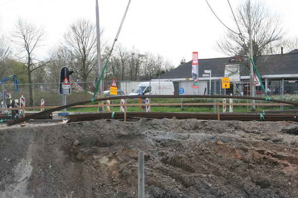 Hier ben ik eigenlijk al te laat met de camera… Een bundel staaldraad wordt neergelaten… Hier lijkt het, alsof de bundel op de bult belandt, maar…. schijn bedriegt! De lange stukken staaldraad zijn voor ‘beneden’, onderin moot 5…
