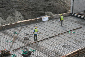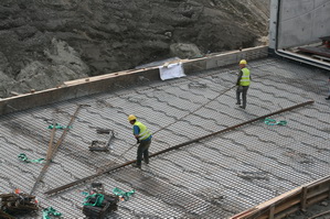 De arena van de staaldraadvlechters, de bundel staaldraad is afgeleverd. Meteen draad voor draad op de goede plek neergelegd.