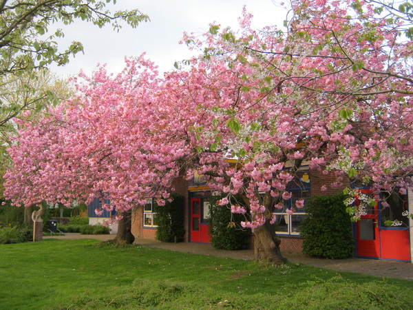 De oude prunussen aan de Oosterweg, bij het gebouw van OBS De Molshoop. Rijke bloei, erg vroeg dit jaar. Hoe lang nog???!