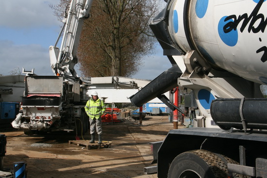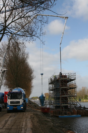 Een volle betonwagen van Kijlstra (Ja, die van de betonmuziek!) nadert achteruit rijdend de bak van de betonpomp. Nee, toch niet helemaal vol… Er zit 12 kuub in. Genoeg voor een rondje beton binnen de zuidelijke pijler. Dan moet er eerst weer worden gewacht op enige harding, droging… Steeds een meter hoger….