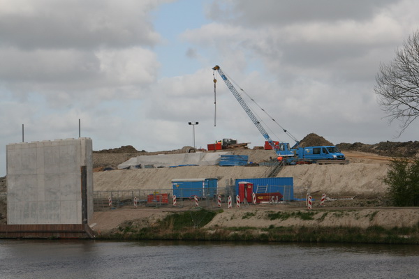 Vanaf de zuidelijke kanaaloever gefotografeerd: Links de pijler aan de noordkant die al keurig, kant en klaar, op zijn draagtaak staat te wachten. Verder het land op de noordelijke landhoofden die ook al grotendeels klaar zijn. Als ik het goed heb begrepen, moeten er nog ‘vleugels’ aan, anti-verschuiving. Twee GMB-timmerlui zijn er dinsdag aan het werk, we ontmoeten ze later nog.