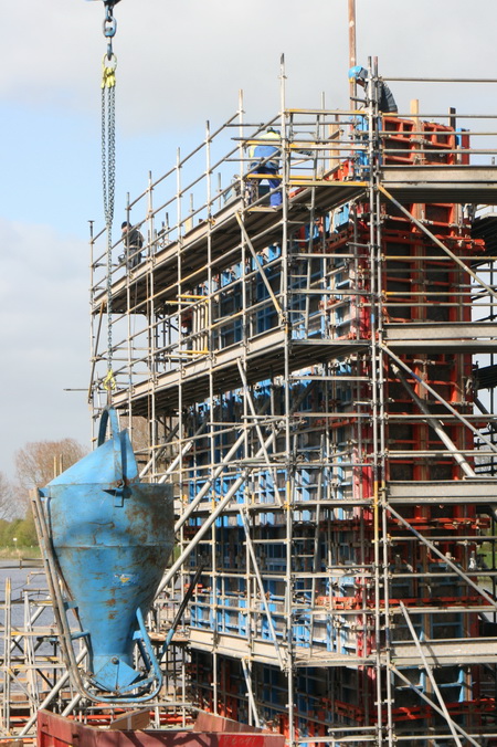 De zuidelijke pijler in aanbouw, een ongelofelijk ingewikkeld kunstwerk (voor mij…), waarmee de bouwers zelf omgaan als een wat groot uitgevallen LEGO-project… (Althans, zo komt het soms op mij over… Het verschil tussen een leek en specialisten…) Links op de voorgrond hangt de kubel, bekend van eerdere blogs. Er gaat een kuub beton in. Ook de kubel wordt ingezet, niet alleen de betonpomp van Faber. Een langdurige stortklus deze dinsdag. Van ’s morgens zeven uur tot ’s avonds een uur of half tien, als alles volgens plan verloopt…. Op het moment dat wij op het toneel verschijnen, verloopt alles volgens plan. (Of dat ook nog zo is, als wij weer verdwijnen….)