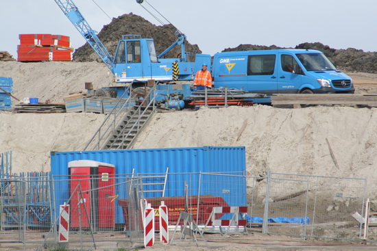 Voor mij als blogger (voor wie de wegverlegging van de N355 beeldbepalend is geworden….) zijn het hoogtijdagen. Eerst maandagmiddag (zie http://www.noordhorntoenennu.com) het eerste bezoek van een basisschoolgroep aan GMB (verbazingwekkend eigenlijk…. Of is ervaringsonderijs, welke variant dan ook, niet meer in tegenwoordig??!), daarna de dinsdagmorgenexcursie met uitvoerder Johan en GMB-secretaresse Pia naar de bouwput van de NVH-brug aan de Zuidhornkant! Zelfs de autorit erheen was voor mij ‘nieuw’. Over het toekomstige tracé van de N355 (nu nog heuvelachtig, bepleisterd met rijplaten en zelfs niet geschikt voor een Groninger onderdeel van een wielrentraject als Parijs-Roubaix…) naar de pijler, “gefundeerd op staal”, en naar de landhoofden, uitstekend boven het landschap. “Gisteren zagen we hier nog reeën”, aldus chauffeur Johan, die ons vervoert in zijn eigen vierwieler, door de GMB-wol geverfd. (“Nee, dat scheurtje in de voorruit gaat niet verder…”) En ik, onrustig in mijn hoofd, maar denkend: “Oei, als ik nou maar weer niet de helft vergeet te kieken…”):