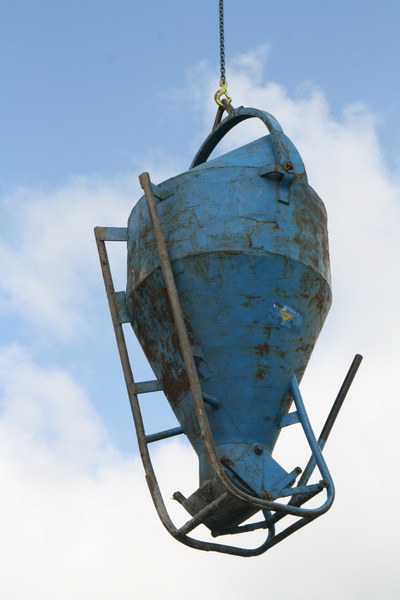 Hier de kubel hangend in de lucht. Lijkt niet zo groot, maar een kuub is heel wat beton! (In een vrachtwagen met draaiende tank gaat meestal 12 à 14 kuub)