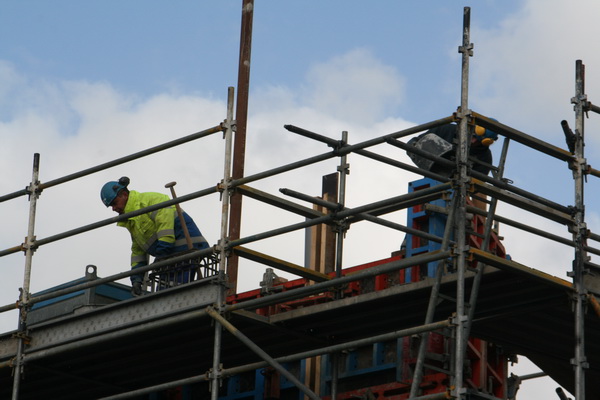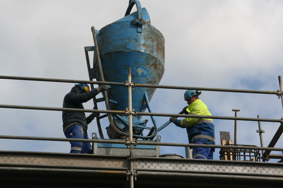 Bovenop de pijler twee stortsystemen in beeld: In het midden de buis van de betonpomp van Faber. Rechts boven de kubel. Links een bestuurder, ik denk van de kraan waarmee de kubel wordt getransporteerd.