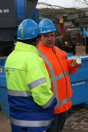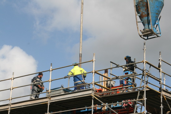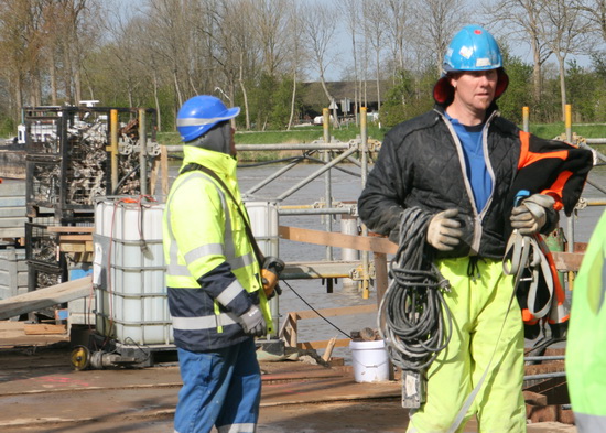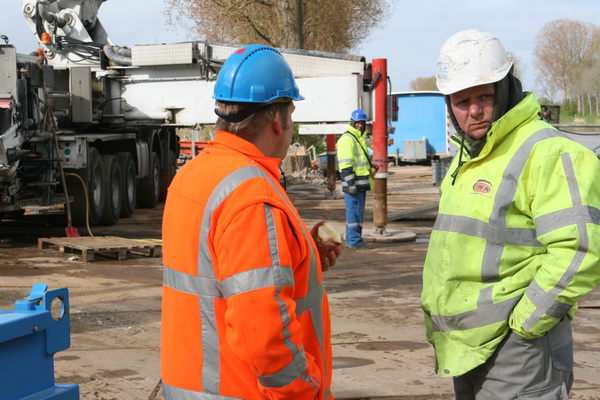 Uitvoerder Johan in gesprek met de betonvoorman. Op de achtergrond de betonpompbestuurder, ook met extra hoofdbescherming. (Bij de gure noordelijke wind niet onprettig, lijkt me…)