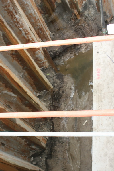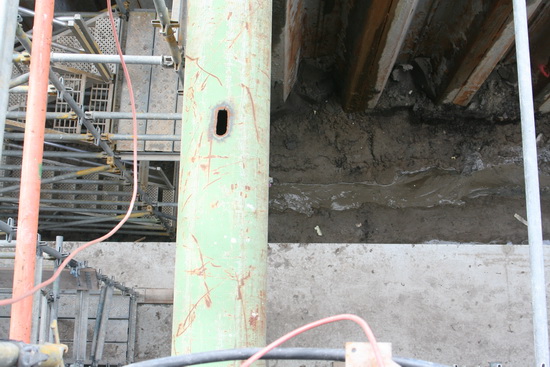 De startfoto, die ik gisteren al iets groter liet zien. De pijler aan de zuidkant, gefundeerd op staal. Er zijn dus niet, zoals aan de noordkant, palen geheid als fundering. De grondlagen aan de zuidkant van het kanaal zijn anders dan aan de noordkant, van grote invloed. Er is een damwandkuip gebouwd, ruim zeven meter diep….