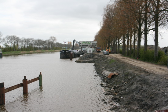 Verderop, richting Aduard, zijn de ontschepers van Martens en Van Oord continu bezig schepen als de “Progress”, “Nelleke”, “Zwaluw” of “Talerna” van hun grondlast te ontdoen, aangevoerd vanaf baggerplekken in het te verruimen Van Starkenborghkanaal.