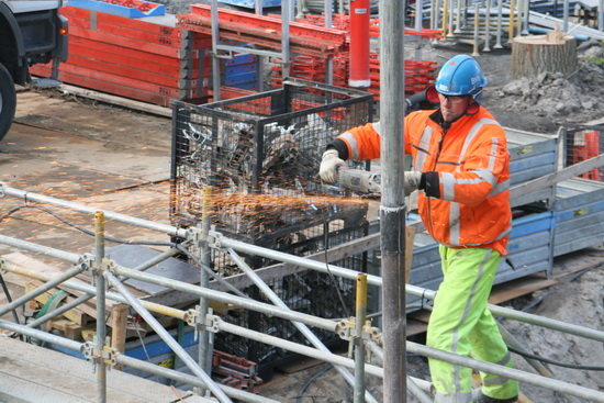 Brugvoorman Jeffrey lijkt zich te bekwamen in het vuurspuwen…. Hij zaagt de buis door en dat veroorzaakt enig vuurwerk. (Waarom de buis moest worden doorgezaagd? Ja kijk, dat heb ik vergeten te vragen… IK moest me concentreren op de klimtocht naar de pijlertop…)