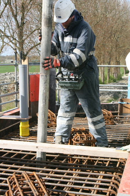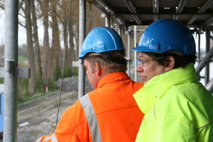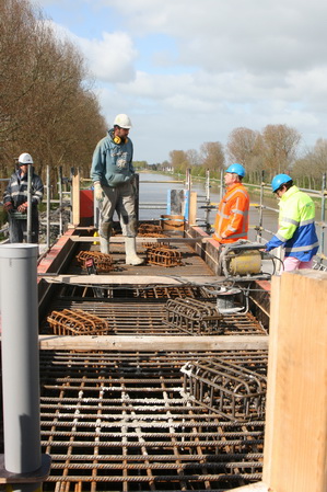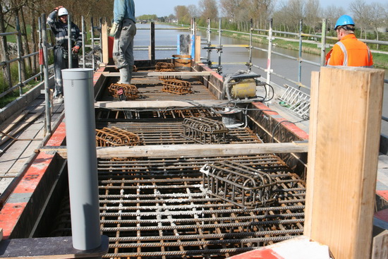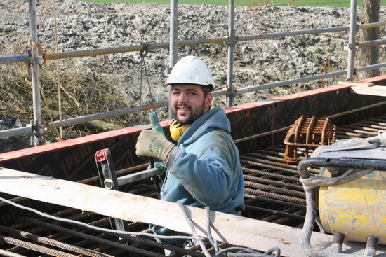 Bovenop de zuidelijke pijler! Ook hier staat een stormachtige wind uit noordelijke richting. Zelfs de betonwerker houdt zijn helm vast! Uitvoerder Johan kijkt met een kennersblik en een kritisch oog, ik met twee een nieuwe wereld ontdekkende kijkers…. “Zie je die korfjes bovenop het vlechtwerk? Dat worden uiteindelijk de blokjes, de steunpunten, die je zo duidelijk aan de overkant ziet!”