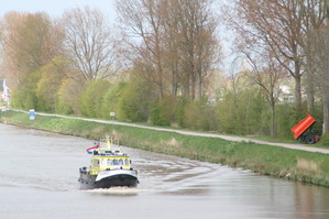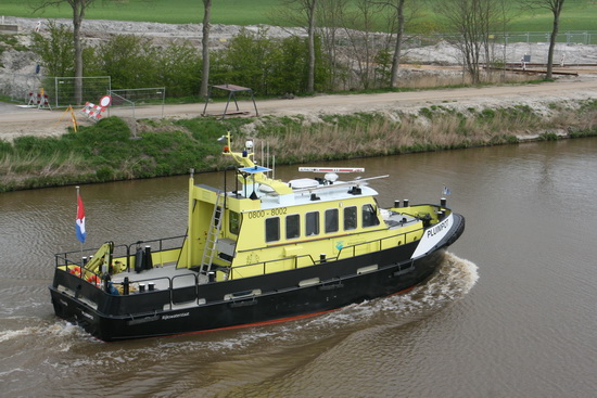 In de verte nadert een ‘oude’ bekende: de “Pluimpot”, inspectieboot van Rijkswaterstaat, thuishorend in de regio “Roermond”… (Verdwaald?)