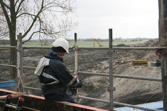 Terug naar dinsdag 15 april jongstleden, nog steeds bovenop de zuidelijke pijler in aanbouw, een unieke belevenis (en dat zult u/zul jij/zullen jullie als blogvolger(s) weten ook…) De bouwput van de NVH-brug waar in de nacht van 24 op 25 mei de ‘bekroning’ gaat plaatsvinden. Dan worden de liggers aangevoerd (vervaardigd in de fabriek van Haitsma Beton in Kootstertille) en op de landhoofden en de pijlers gelegd!