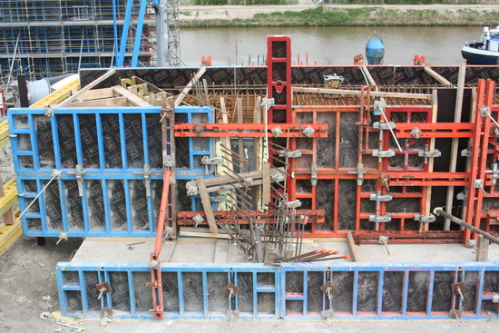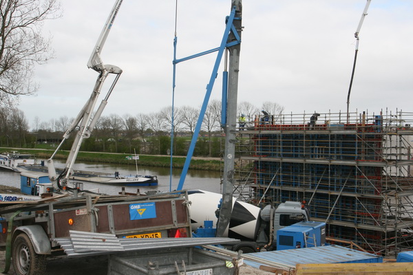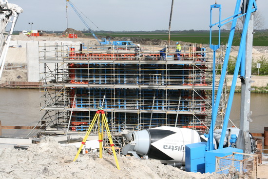 Zo krijg je een mooi overzicht voor wat betreft de ligging van de NVH-brug. Op de voorgrond de bekiste landhoofden; dan aan de kanaalkant de zuidelijke pijler in aanbouw; aan de overkant van het water de noordelijke pijler, die klaar is; daar weer schuin achter de noordelijke landhoofden. En ja, de nieuwe brug komt schuin over het water te liggen…. Zo’n 150 meter lang!