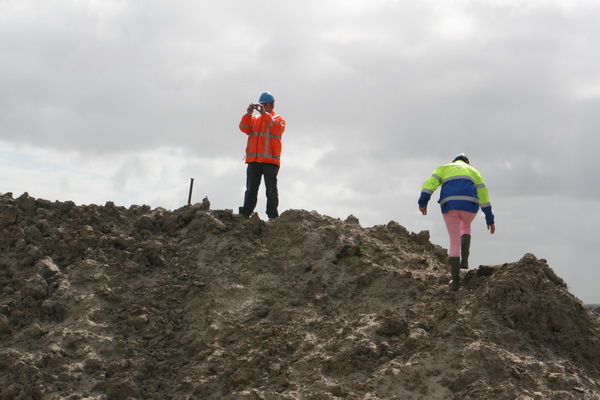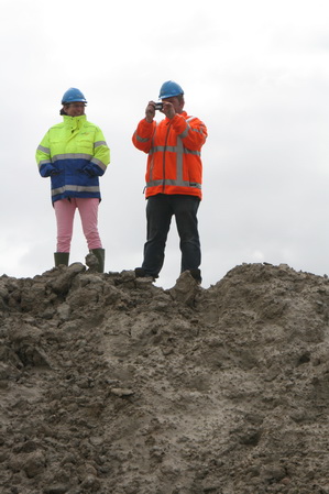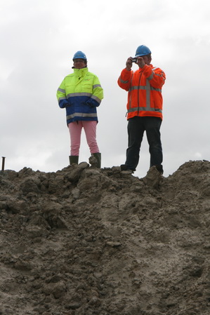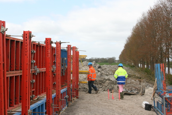 Uitvoerder Johan en GMB-secretaresse Pia lopen langs de bekiste landhoofden aan de zuidkant. Hier is de betonstort nog niet voltooid… Bij Pia de roze latjes die een vast steunpunt markeren, van belang voor Geometer Aart…