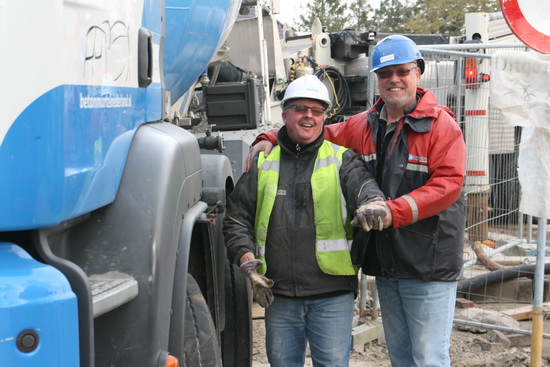 De stemming is deze betondonderdag opperbest! (En niet alleen op déze dag!) Links de vertrekkende chauffeur, rechts de chauffeur van wie de auto nu gelost gaat worden… Eigenlijk is het niet alleen het beton dat de muziek maakt, vooral de chauffeurs!