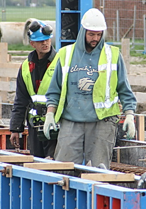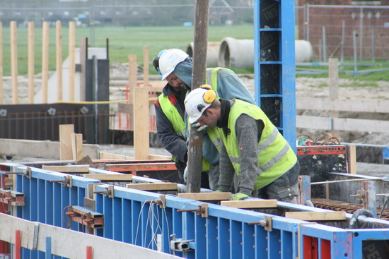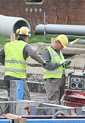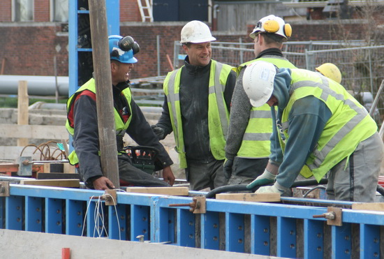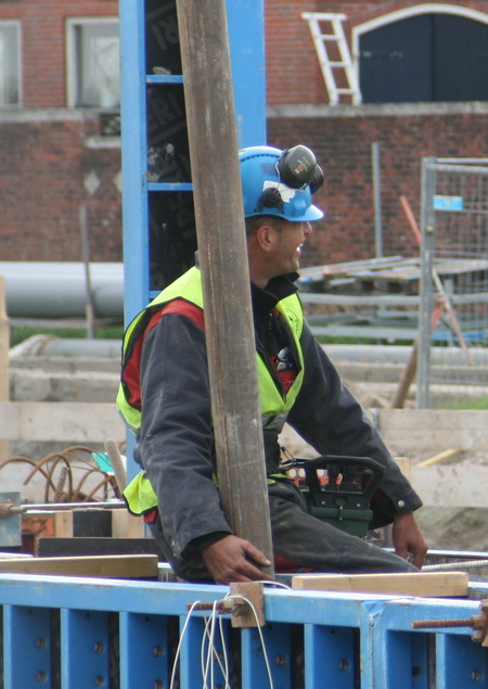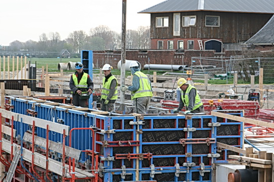De vier betonwerkers bij de wanden van de pompkelder: Stuurman, prikker, storter, bezoeker…. Zouden dit ook allemaal supporters van PEC Zwolle zijn?! Dan hebben ze een geweldig Paasweekeinde gehad! (Niet vergeten om uitvoerder Kees Kranenburg te feliciteren met de royaal verdiende overwinning op het teleurstellende Ajax. Wat wil je ook, als je zulke supporters meeneemt ter ondersteuning! Die Amsterdammers kwamen voor het vuurwerk, niet voor het voetbal…)
