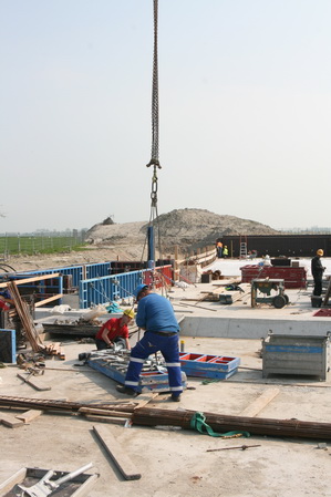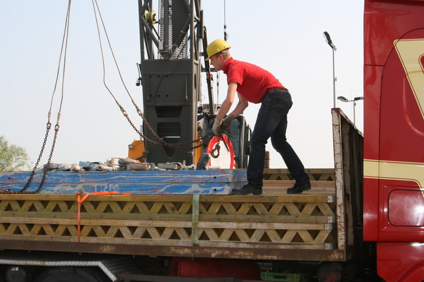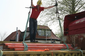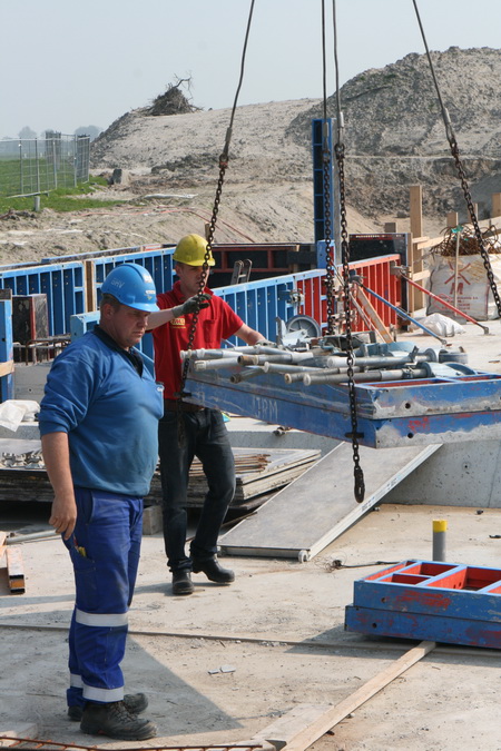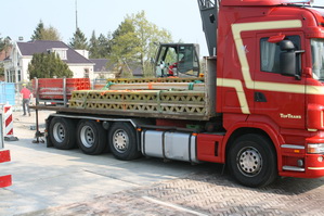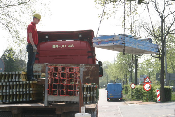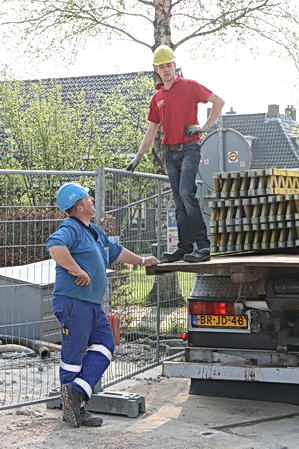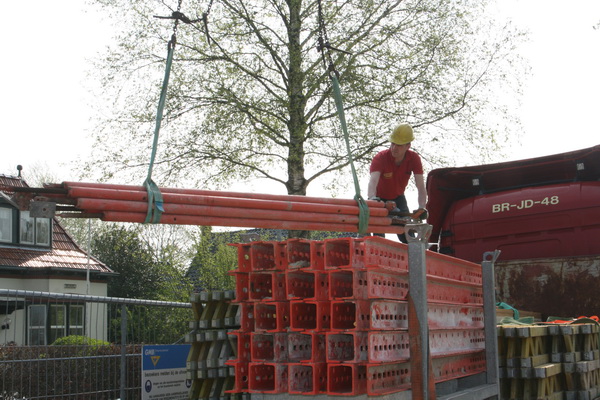 Links het pakket steunstangen voor bekistingselementen dat de hoogte ingaat vanaf de bodem van moot 5. Rechts het ontvangstcomité bij de auto van TopTrans.