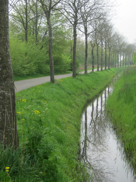 De bekende bomenspiegeling in het slootwater, maar nu in een volkomen groene entourage. Met gele paardenbloemaccenten…